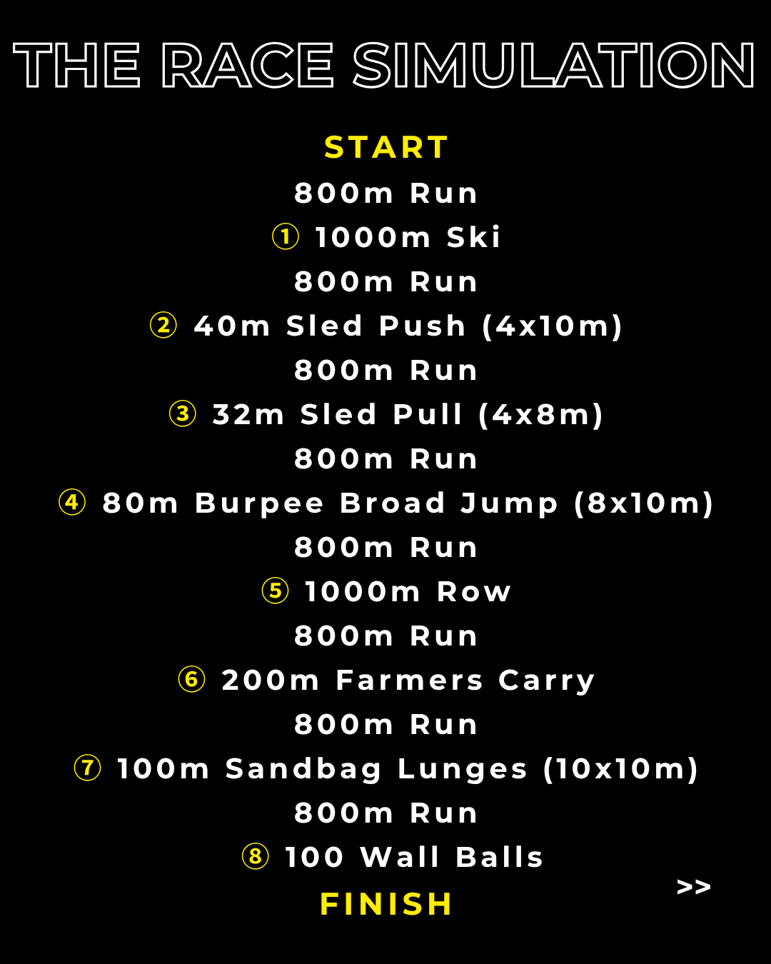Important:This is not for beginners. You should already know the stations and how they work. There is no warm-up, movement or cool-down coaching — this is a race simulation.